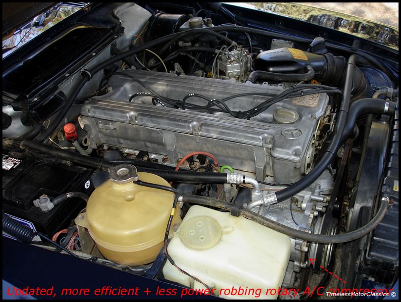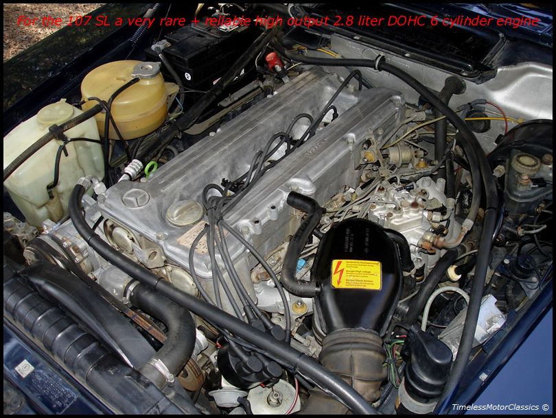 15: The M-110 6 cylinder engines naturally can be a little noisier than their V-8 counterparts due to their smaller displacement, double over head cam shafts and higher RPM power band. Nevertheless this cars' well maintained and adjusted engine is extremely quite for a M-110 engine. A well maintained and adjusted M-110 6 cylinder engine can actually ad more to the 107 SL's sportiness and fun factor over their heavy V-8 counterparts.